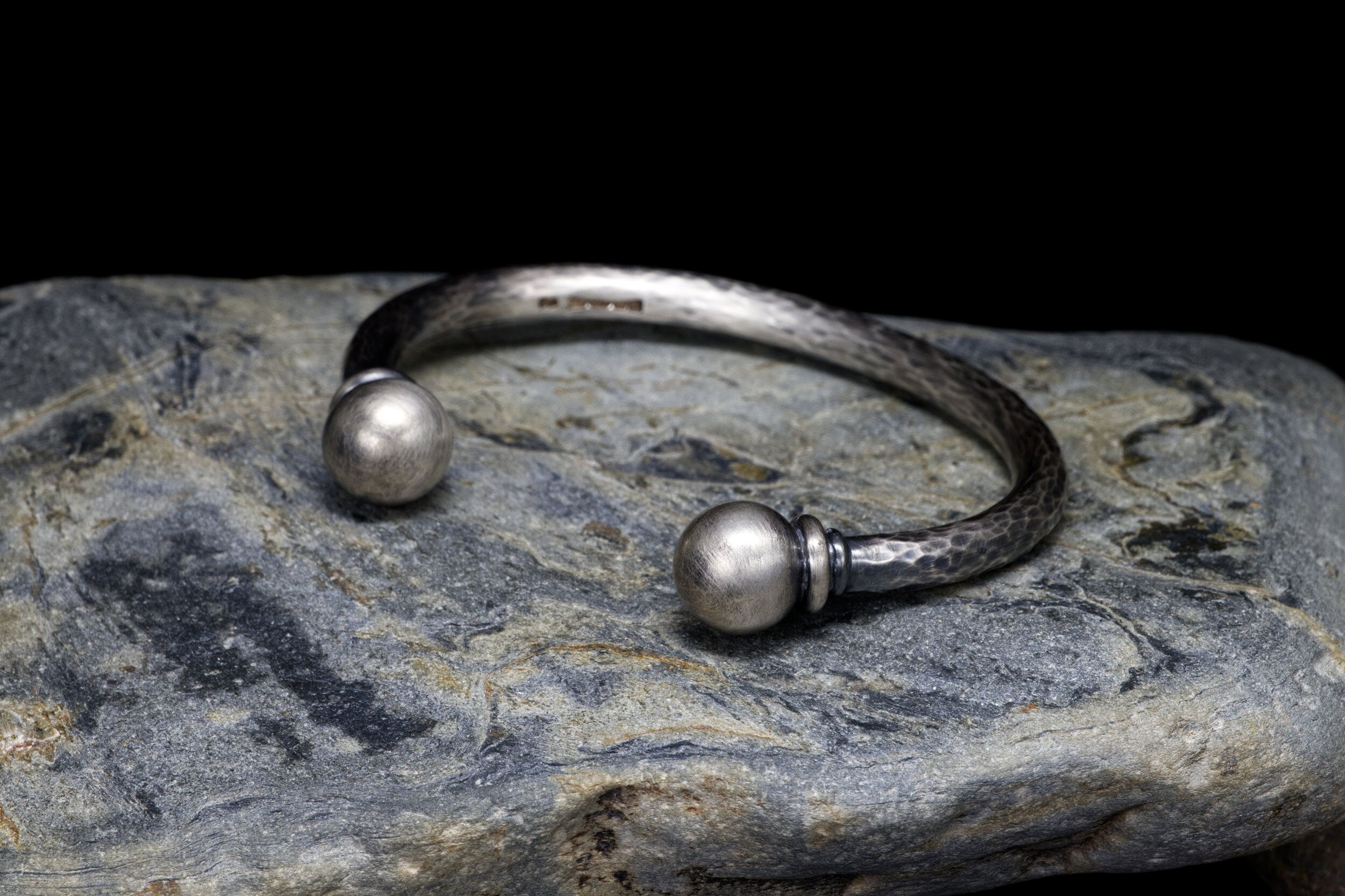 This impressive silver Torque bracelet is handmade from a solid round bar of sterling silver which I hand forge and solder heavy solid 14 mm silver balls onto the ends. It is hand-hammered with an oxidised satin finish or polished.