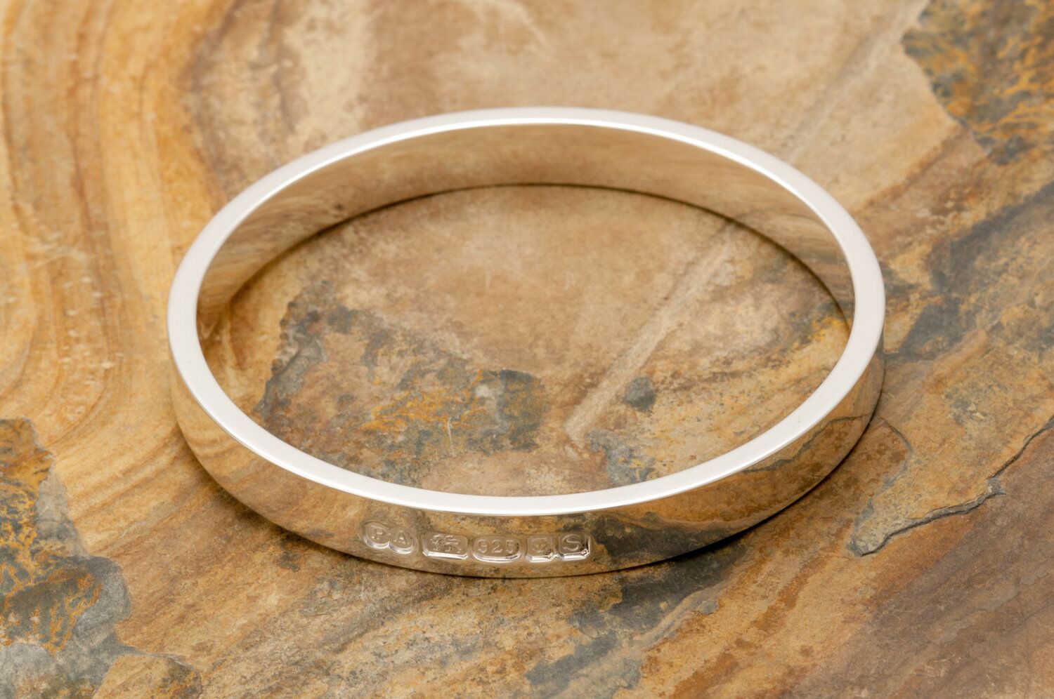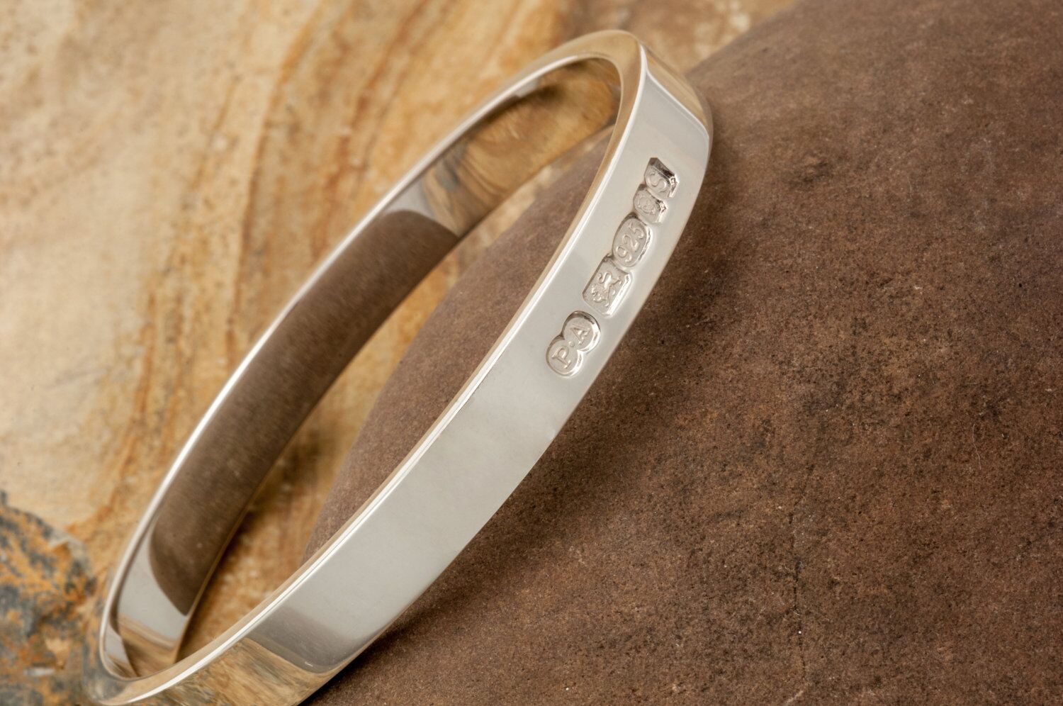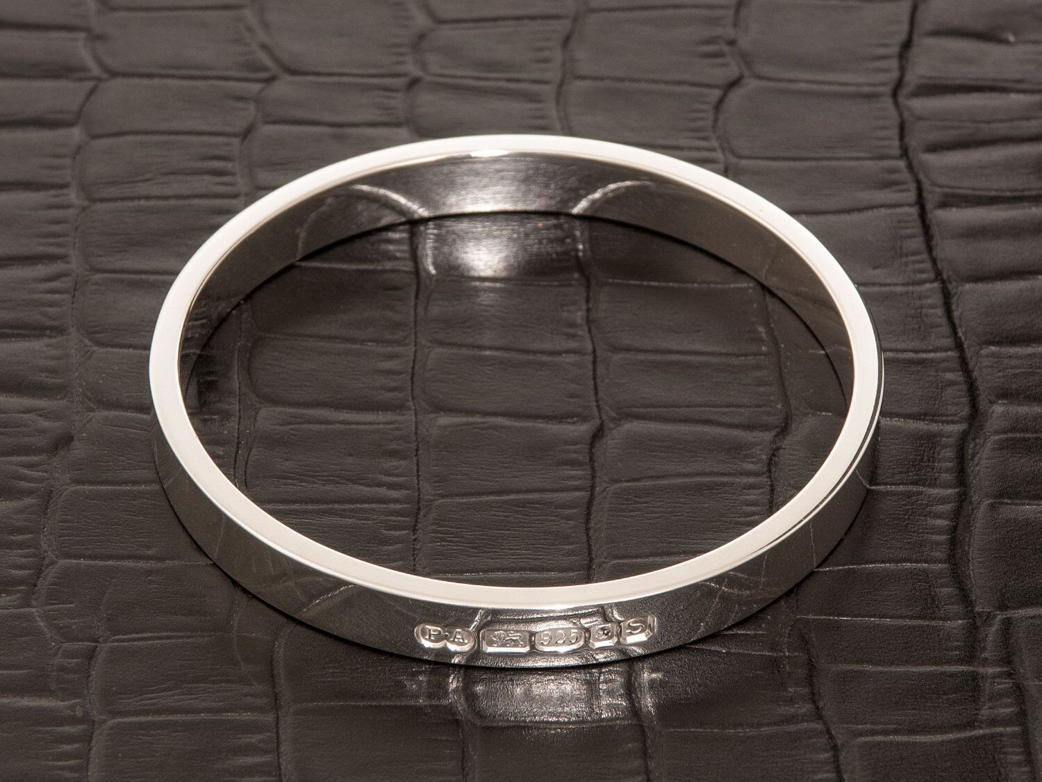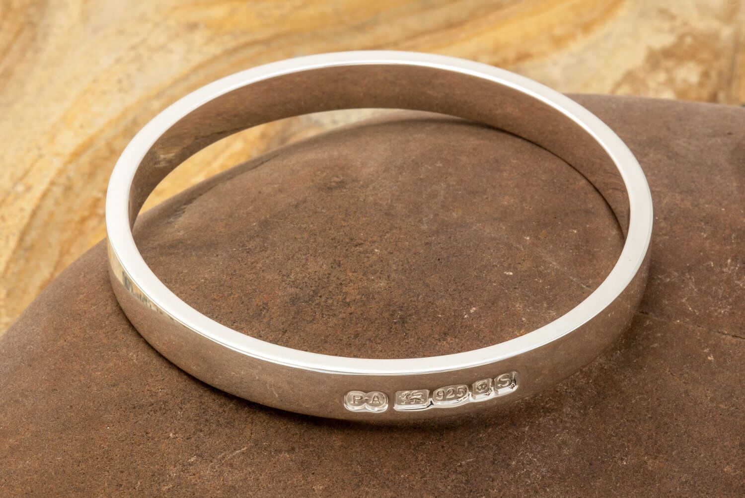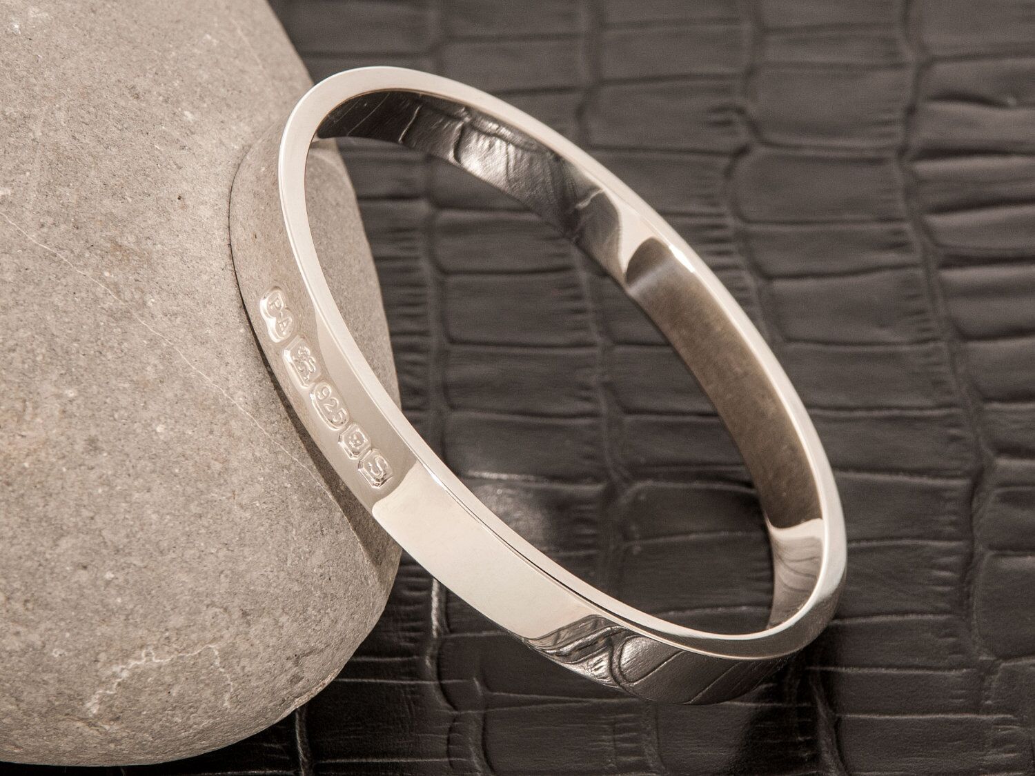 Chunky 8mm Solid Silver Bangle, the Zennor 8 Rectangle profile bracelet is Handmade with outside display London Hallmarks – 8mm wide.